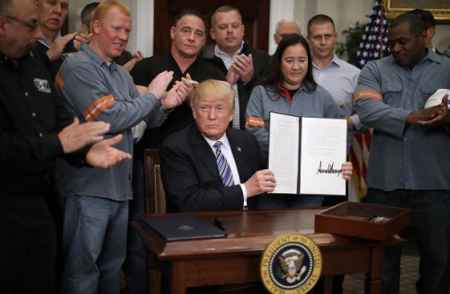 “Today I’m defending America’s national security by placing tariffs on foreign imports of steel and aluminum,” Trump said, flanked by workers from the industries and economic advisers who had backed the plan.