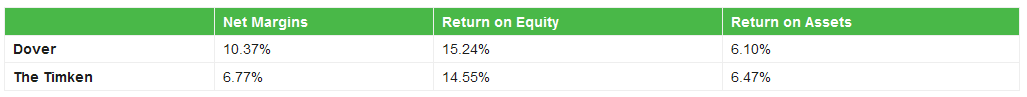 This table compares Dover and The Timken’s net margins, return on equity and return on assets.