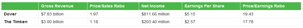 This table compares Dover and The Timken’s gross revenue, earnings per share and valuation.