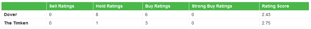 This is a breakdown of current ratings for Dover and The Timken, as provided by MarketBeat.