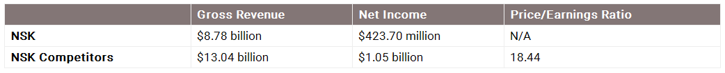 This table compares NSK and its peers gross revenue, earnings per share and valuation.