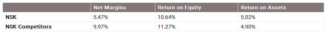 This table compares NSK and its peers’ net margins, return on equity and return on assets.