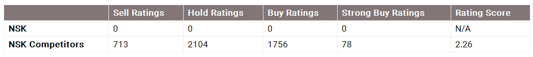 0.1% of NSK shares are owned by institutional investors. Comparatively, 46.1% of shares of all “Private households” companies are owned by institutional investors. 0.9% of shares of all “Private households” companies are owned by insiders. Strong institutional ownership is an indication that endowments, large money managers and hedge funds believe a stock will outperform the market over the long term.